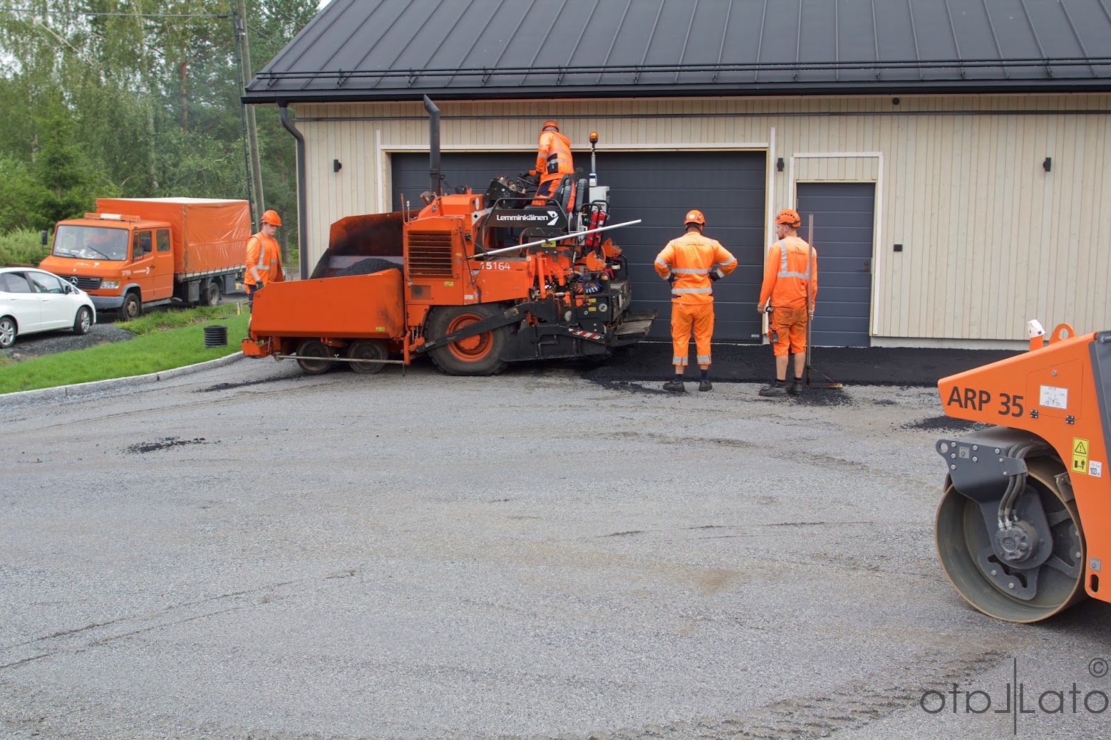 Itse asfaltointi oli sitten seuraavana päivänä ja koneen taisi olla pihassa puolen seiskan jälkeen aamulla. Lounaaseen mennessä homma oli ohi ja pinta valmis. Jännää touhua siis minun mielestä, Pee ei oikein omannut samaa innostuneisuuden astetta tästä tapahtumasta (?), jokaisella miehellä on oma hommansa ja aika vähän niiden tarvitsee keskenään jutella. Nyt kun kunta saisi vielä tuon meidän kadun korjattua, alkaa olla aikamoista kynnöspeltoa. Enää pienen kiveyksen rakentaminen pihahommat alkaa olla nipussa.